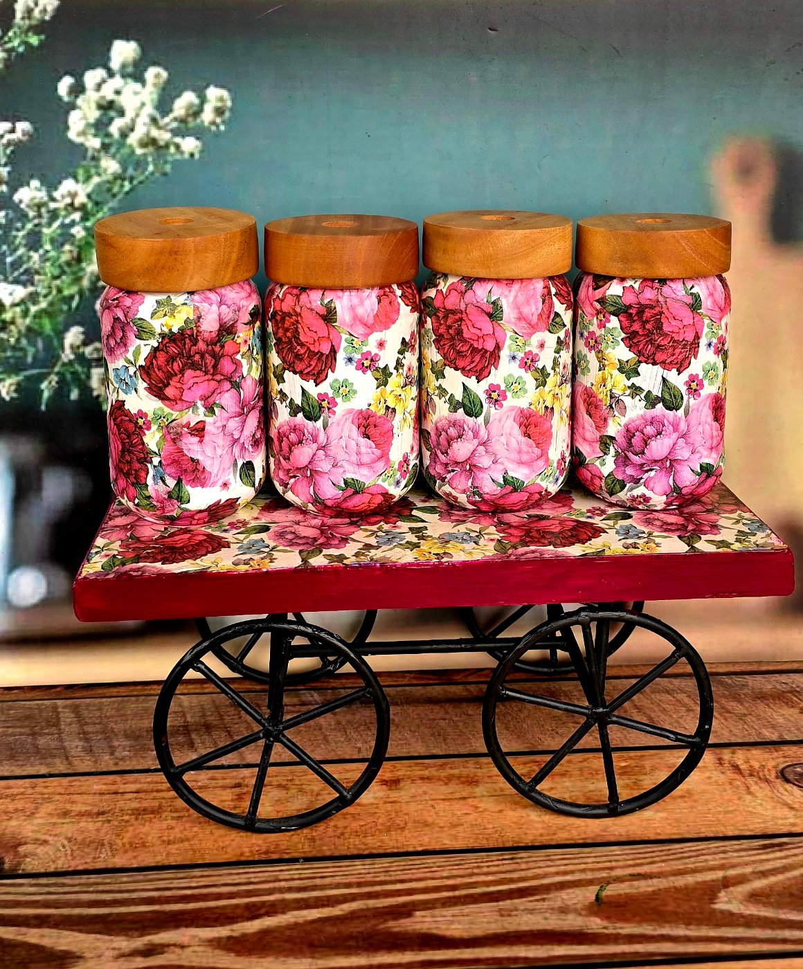 This enchanting set features four wooden-lidded jars, adorned with vibrant hand-painted floral motifs, nestled neatly on a charming wrought iron cart. Perfect for serving or storing variety of pickles and spices, it adds a touch of rustic elegance to your dining or kitchen counter. Expertly decopainted by artisans, this unique set is a delightful blend of functionality and traditional craft.